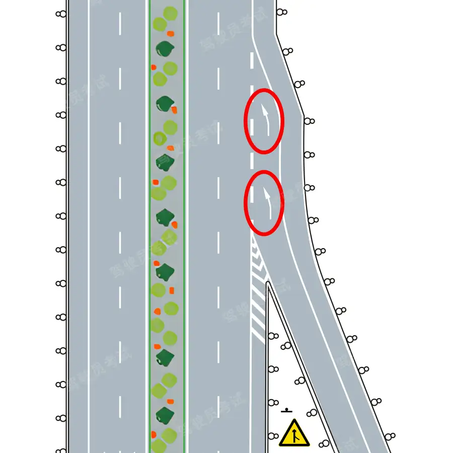 • 红圈内导向箭头提示前方需向左合流。正确错误